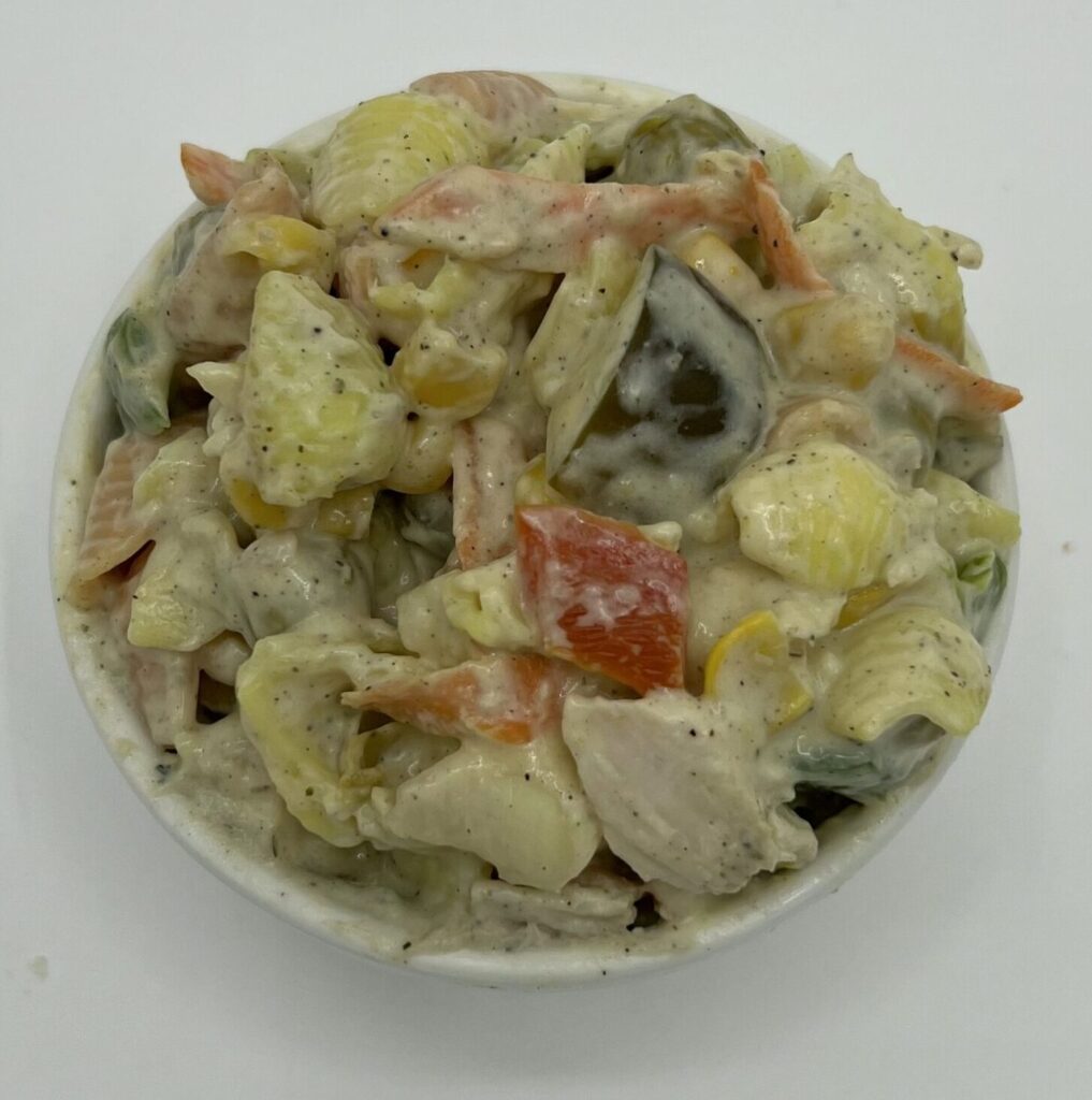 سالاد ماکارونی با مرغ ویژه درنا، ترکیبی از ماکارونی، ذرت، نخود فرنگی، هویج، فلفل دلمه، خیارشور و مرغ اسلایس شده با ادویه و سس مخصوص درنا. گزینهای عالی برای یک وعده غذایی خوشمزه و سالم.